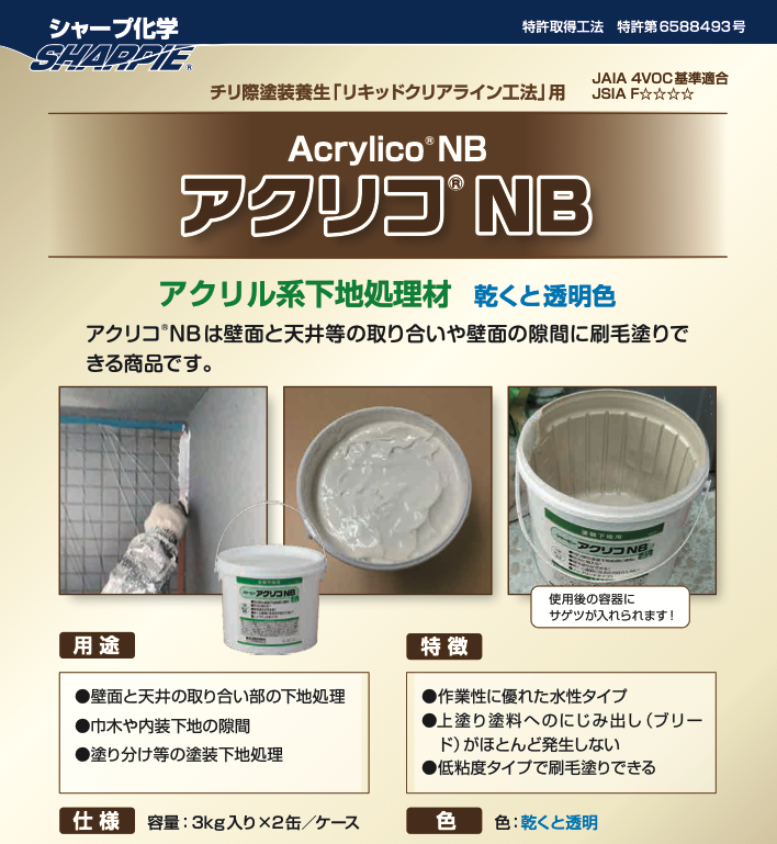 「アクリコ®NB」は、塗装における「にじみ」という普遍的な悩みを解決するために生まれた、シンプルかつ非常に優れたイノベーションです。「塗るときは白、乾けば透明」という魔法のような特性と、「リキッドクリアライン工法」という確かな技術が、誰でもプロレベルの仕上がりを実現する手助けをしてくれます。